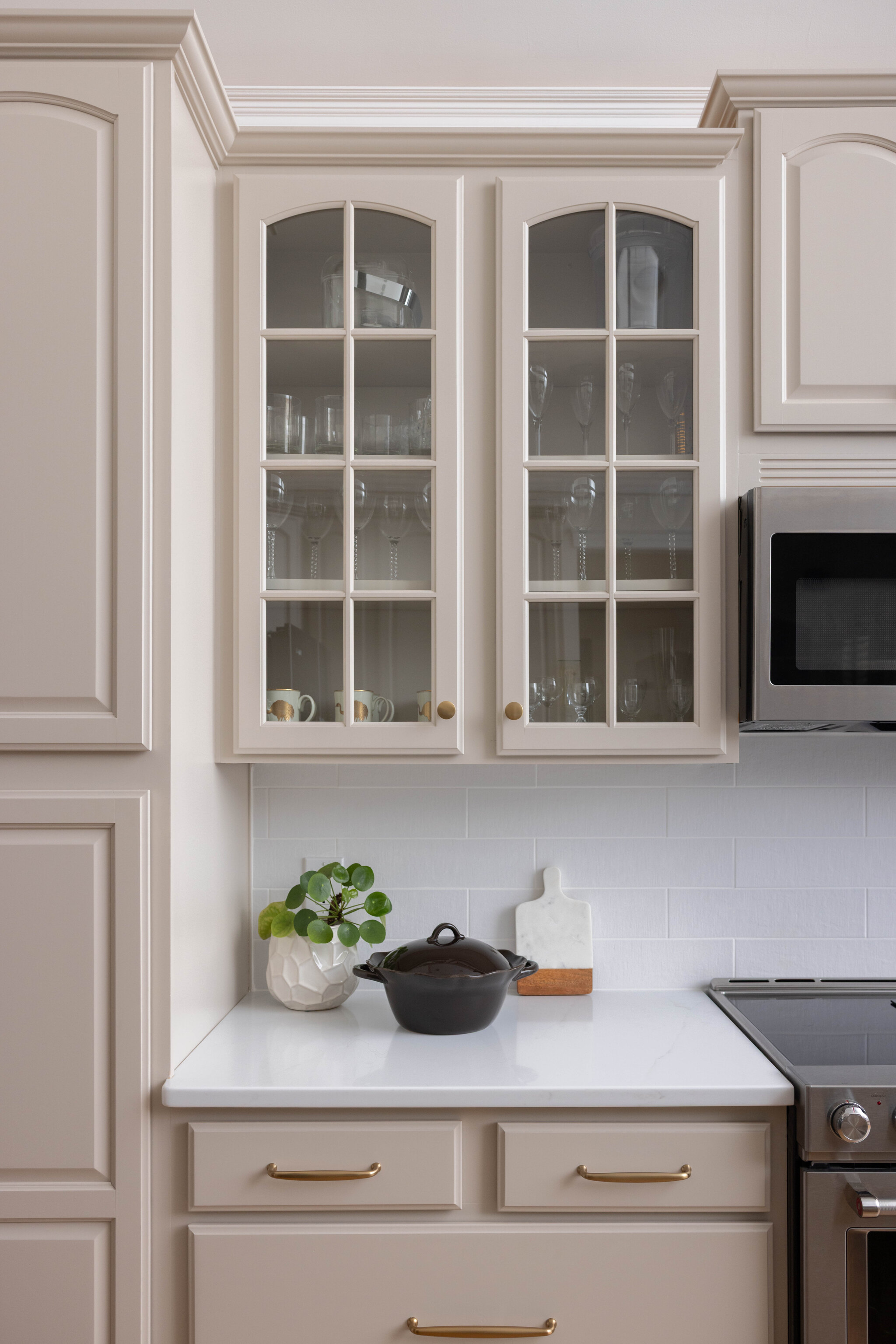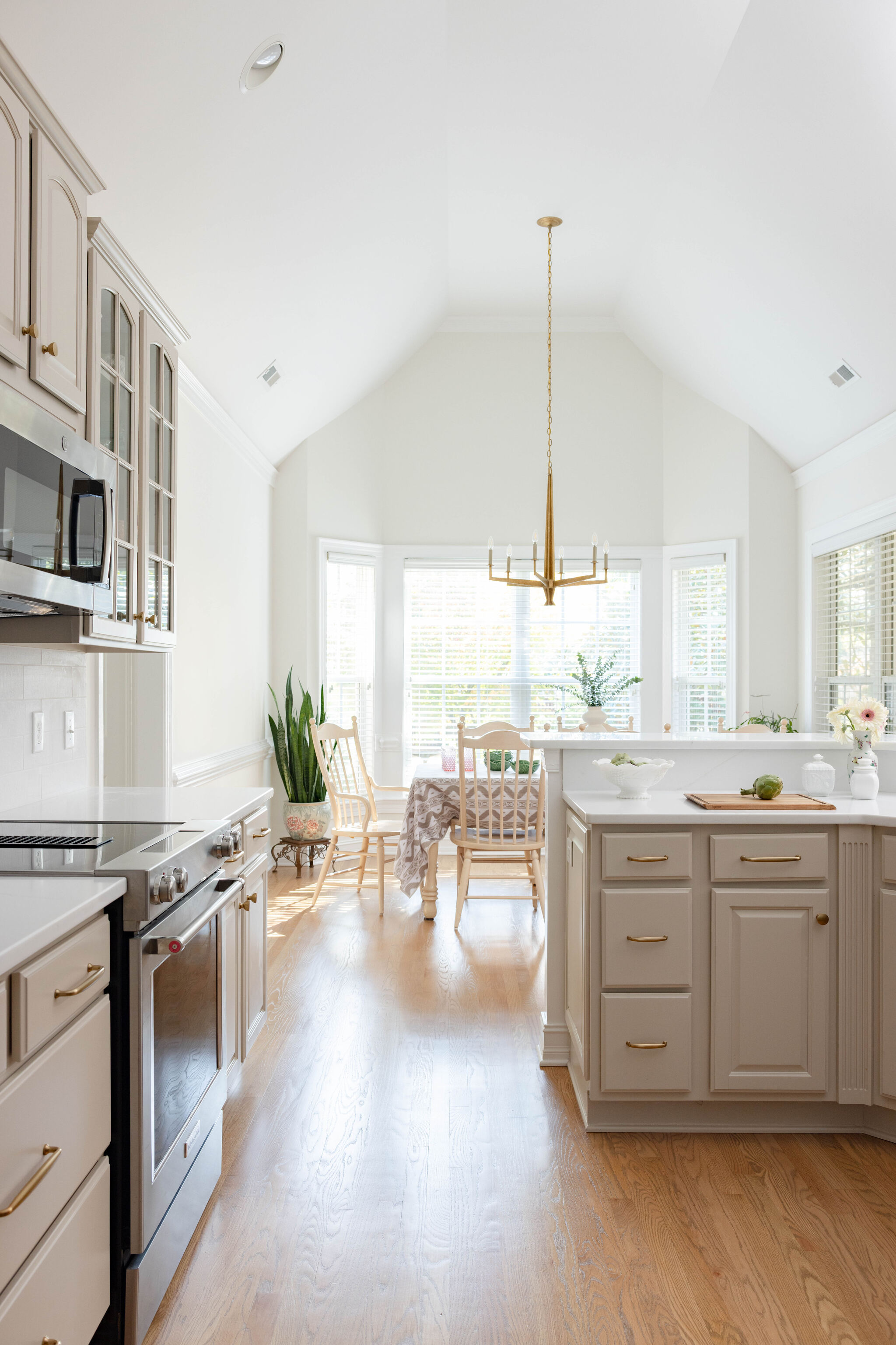 In the kitchen, the existing layout was retained and refined. Original cabinetry was reimagined in a soft taupe finish to maintain its warmth, paired with elegant quartz countertops and a ceramic tile backsplash that brighten and modernize the space. Subtle architectural details, including picture frame molding at the peninsula, add a sense of craftsmanship while quietly improving durability. Brass hardware brings a restrained touch of shine, complementing the home’s collected character without overpowering it. Bathrooms became an opportunity to introduce moments of personality through pattern and color. In the primary suite, a chic checkerboard floor anchors the space with a timeless yet playful feel, balanced by soft finishes and irregular tile textures that add depth. The guest bath leans slightly bolder, with patterned flooring and a light pink wash on the walls that brings warmth and charm while remaining refined and approachable. Throughout the home, modern lighting, freshly refinished floors, and carefully planned artwork placement help tie old and new together. Existing pieces were thoughtfully integrated with updated finishes, allowing the home’s story to continue rather than start over. The result is a space that feels familiar yet refreshed, functional yet personal, and ready to support the next chapter of everyday life.