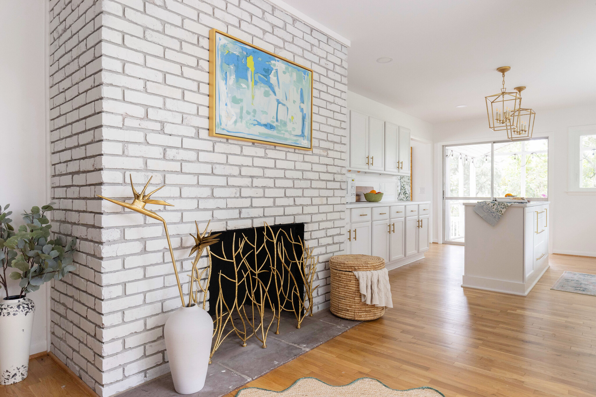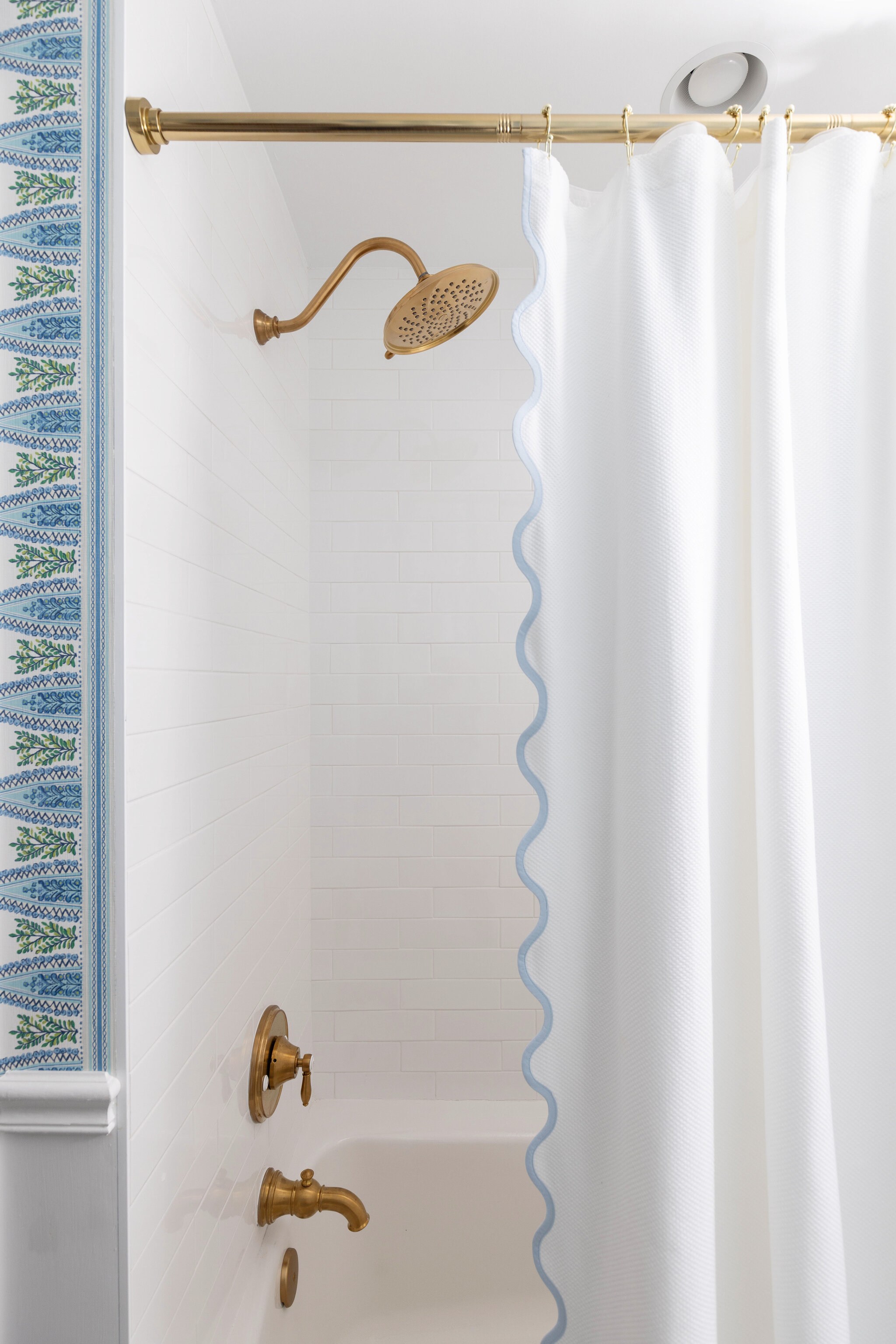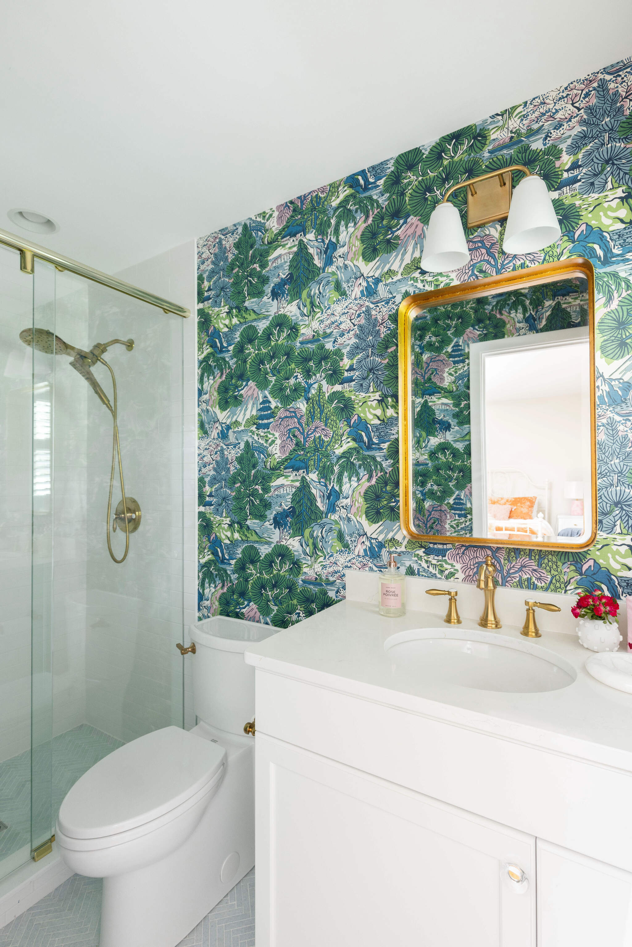 The kitchen was reworked to prioritize light and view over excess cabinetry. Upper cabinets were removed in favor of a wall of windows, allowing the outdoors to become part of the daily experience. A thoughtfully designed island replaced lost storage while maintaining function and balance. In the bathrooms, pattern became a defining design element. Wallcoverings were selected early in the process and helped guide decisions throughout the home. Each bathroom features its own distinctive pattern, yet they share a sense of movement, color, and mood that feels cohesive and attuned to both the client and the space. Thoughtfully chosen tile, mirrors, and lighting complement the wallcoverings rather than compete with them, allowing the bathrooms to feel playful, layered, and intentional. Original hardwood floors uncovered during renovation were refinished and integrated with newer flooring, preserving a sense of continuity throughout the home. Outside, a limewashed exterior softens the facade and unifies the structure, bringing a calm, cohesive finish to the project as a whole.