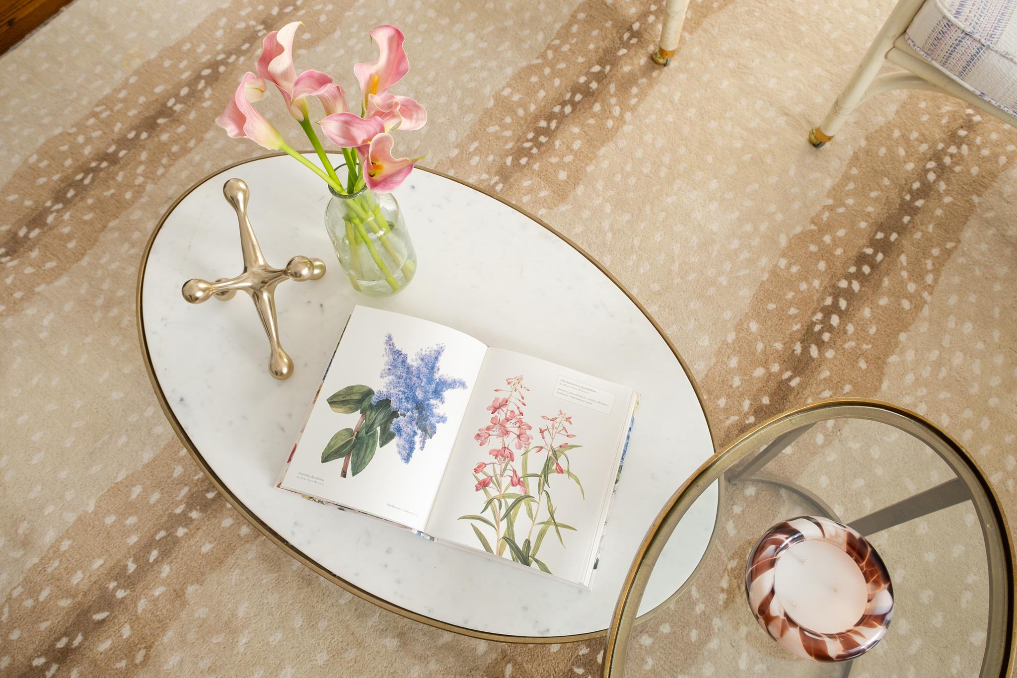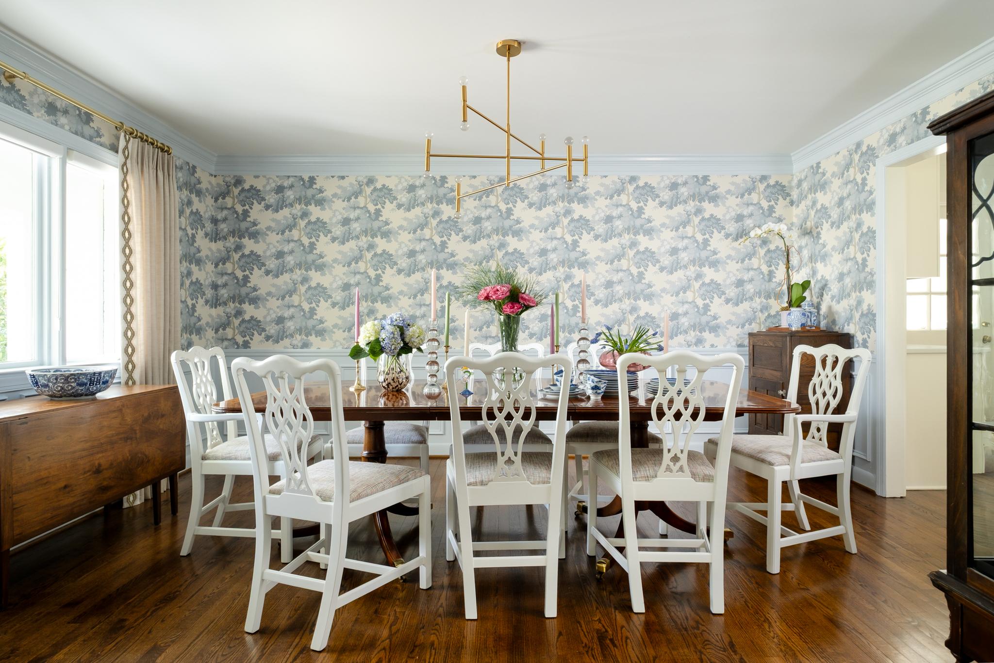 In the foyer, the original concrete floor had seen years of wear. Rather than replace it, we embraced its imperfections and turned it into a feature. A hand-stenciled pebble pattern in soft, organic tones now sets the stage, pulling colors from the adjacent dining room wallpaper and offering a charming first impression. The living room was reimagined to invite gathering, with refreshed furnishings, subtle patterns, and heirloom pieces layered together for a look that is refined but never untouchable. The dining room became the true showpiece, wrapped in wallpaper inspired by an 18th-century tapestry. Its soft branches and faded hues bring movement and lightness, cooling the deep mahogany of the antique table and casegoods while playing beautifully against a modern chandelier. The result across all three spaces is a home that honors family tradition while confidently embracing the present, endearing and memorable in every detail.